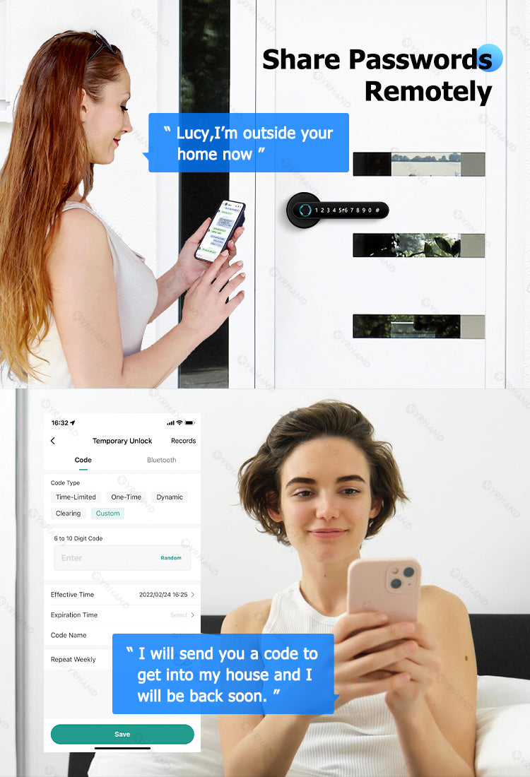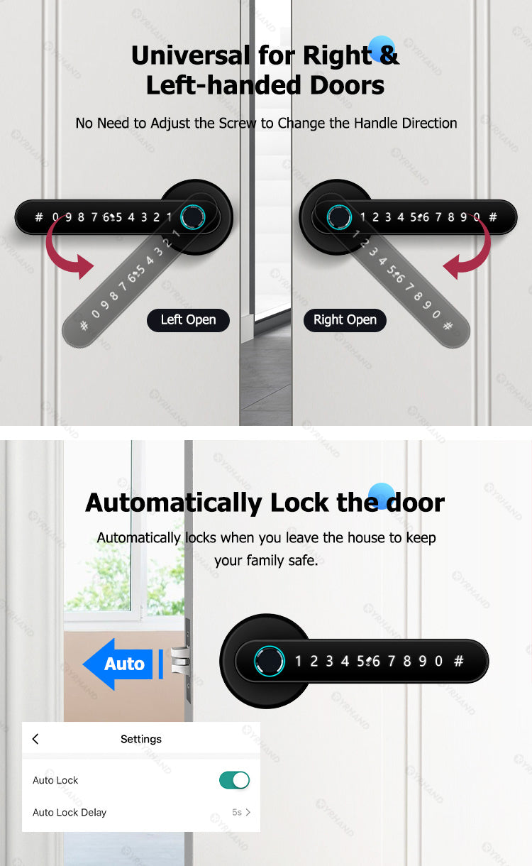 The YRHAND H24 lock comes with a virtual password feature to prevent unauthorized access. This anti-peeping technology ensures added security by allowing you to input extra digits before or after your actual password, keeping your code hidden from prying eyes. Perfect for those seeking both privacy and security in a smart lock.